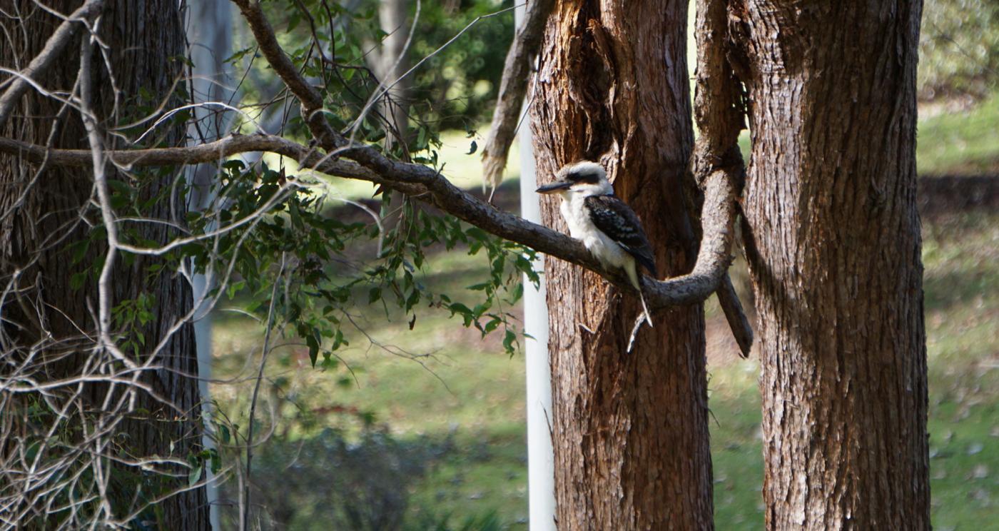 Two of the four species of kookaburras (terrestrial tree kingfishers) are found around the Bendles cottages in Maleny: the Blue-Winged kookaburra (usually found in the moister parts of northern Australia, including the Top End and as far south as Broome on the west coast and Brisbane on the east) and the Laughing kookaburra (usually found all along the east coast from the Eyre Peninsula to Cape York, southwest of Geraldton on the west coast and Hopetoun on the south coast, westwards from Victoria to the Yorke Peninsula, Tasmania, the Flinders Ranges and Kangaroo Islands.